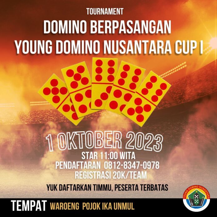 KLIKKALATIMNUSANTARA.COM- Young Domino Nusantara (YDN) akan menggelar Tournament Young Domino Nusantara Cup I pada Minggu, 1 Oktober 2023 di Kompeks Universitas Mulawarman. Tournamen tersebut akan menggunakan sistem berpasangan.